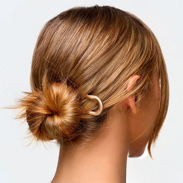 Basta girar e prender seu cabelo no estilo desejado e deslizar um dos grampos através do cabelo para fixar seu coque: é simples assim!