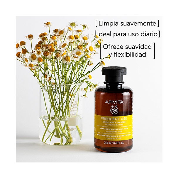 O champú suave de uso diário com camomila e mel é ideal para uso frequente e adequado para todos os tipos de cabelo:
