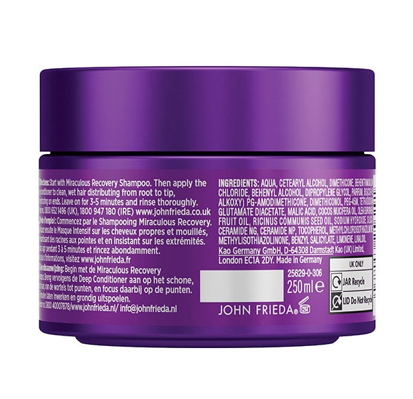 ¡Recupere seu cabelo e diga adeus ao frizz! A Máscara Frizz Ease Miraculous Recovery é formulada com poderosos ingredientes hidratantes que nutrem e reparam o cabelo danificado. Além disso, reduz o frizz, deixando o cabelo visivelmente mais suave desde o primeiro uso. A linha Miraculous Recovery contém uma fórmula exclusiva com ceramidas que repara as cutículas do cabelo seco e danificado, e reduz o frizz em 86% em um único uso.