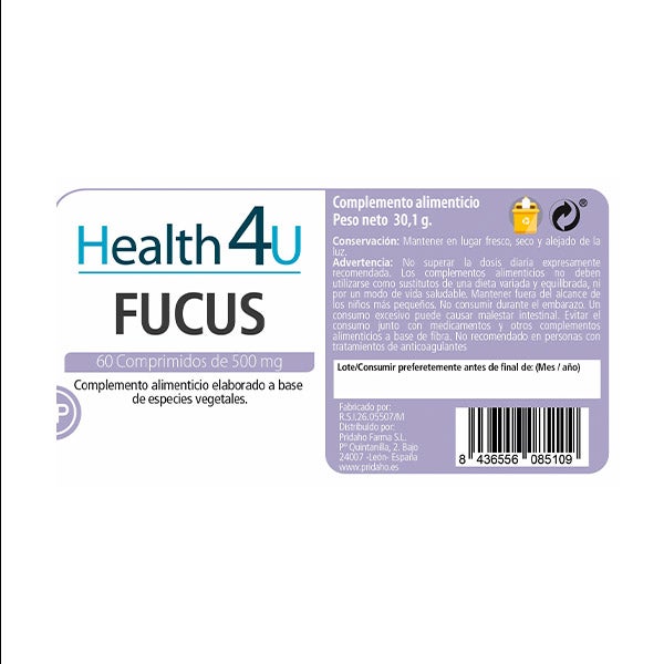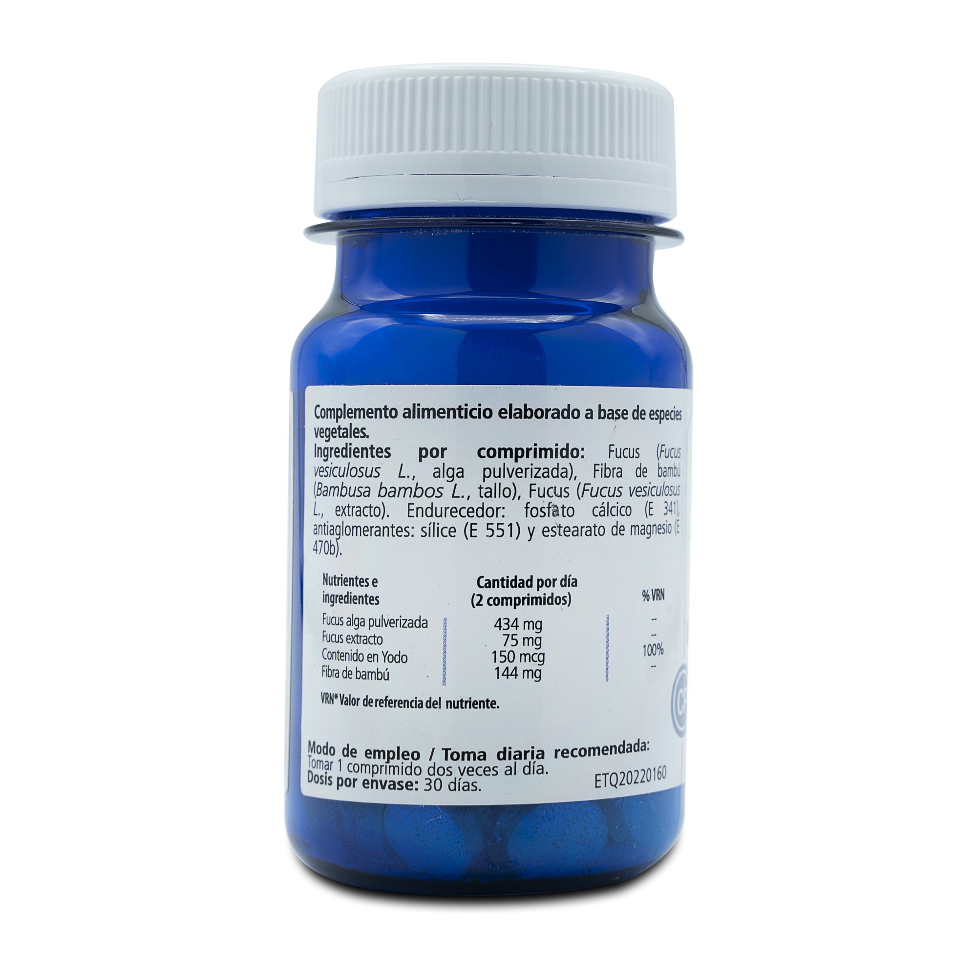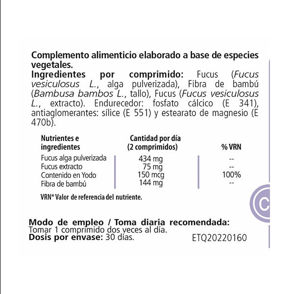 Ingredientes por comprimido: fucus (Fucus vesiculosus L., alga pulverizada), fibra de bambú (Bambusa bambos L., tallo), fucus (fucus vesiculosus L., extracto). Endurecedor: fosfato cálcico (E341), antiaglomerantes: sílice (E551) y estearato de magnesio (E470b).