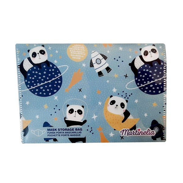Capa para guardar máscaras protetoras infantis com estampa de pandas.