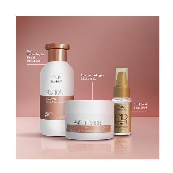 Champô Fusion: Repara o cabelo danificado deixando-o limpo e cuidado. Com tecnologia EDDS que elimina as impurezas metálicas graças à sua ação antioxidante.