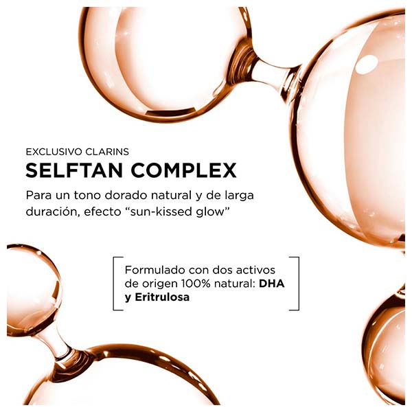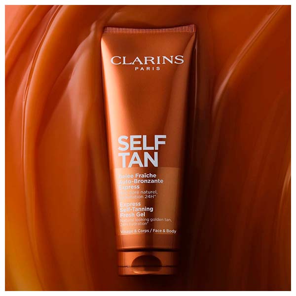 Express Self-Tanning Fresh Gel da Clarins é um gel autobronzeador para rosto e corpo que proporciona um tom dourado natural e homogêneo, realçando a luminosidade da pele sem necessidade de exposição solar. Sua textura fresca e transparente aplica-se com facilidade, absorve-se rapidamente e não deixa sensação pegajosa nem marcas, permitindo vestir-se imediatamente.