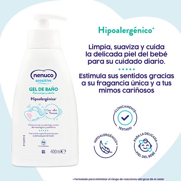O Gel de Banho Nenuco Sensitive é hipoalergênico, formulado especificamente para a delicada pele do bebê.