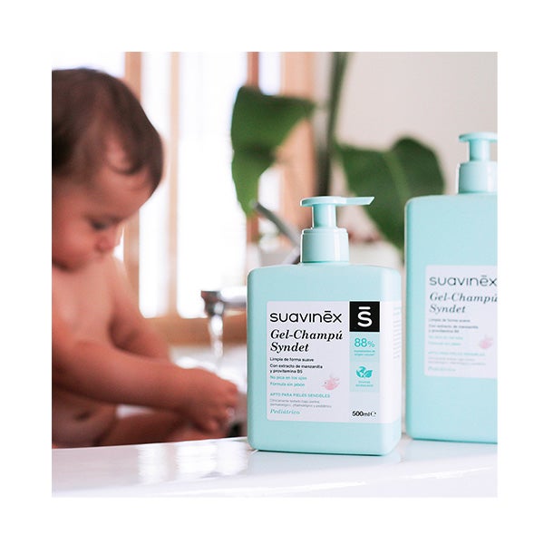 Gel-champô Syndet Suavinex sem sabão. Não arde nos olhos.