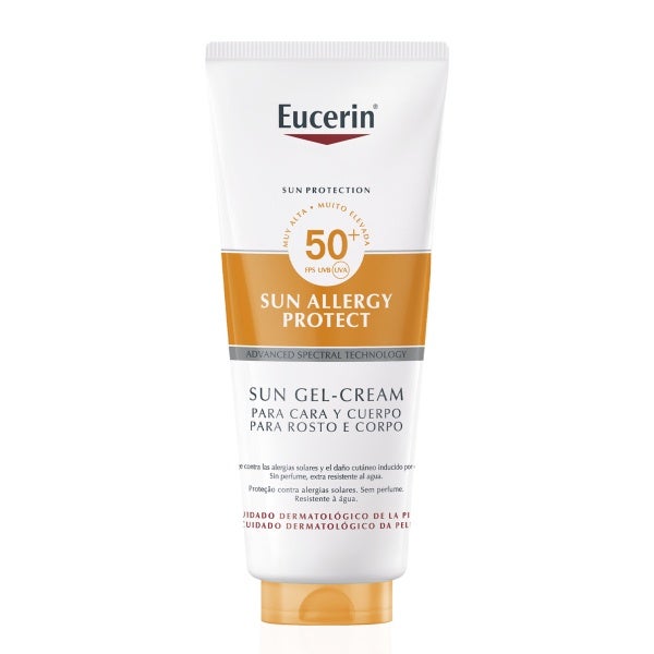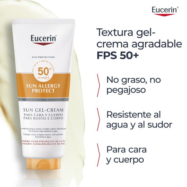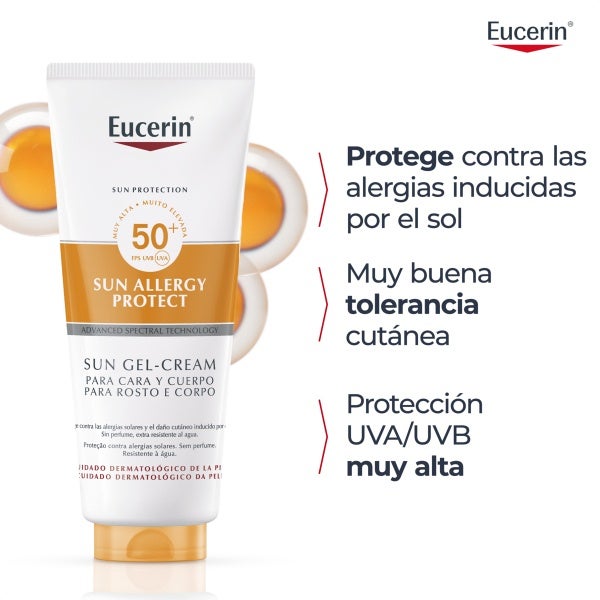 Eucerin Sun Allergy Protect Gel-Creme FPS 50+ é um protetor solar para rosto e corpo especialmente formulado para pele sensível ao sol e pele propensa a alergias solares como a erupção polimorfa luminosa (EPL).
