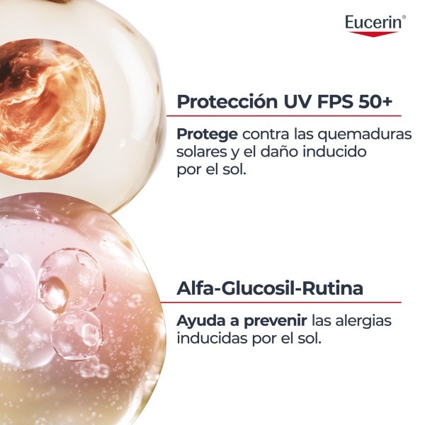 O protetor solar para alergias solares oferece uma proteção muito alta contra raios UV: os filtros contra raios UVA e UVB cumprem os altos padrões definidos pela Cosmetics Europe e os níveis de proteção contra raios UVA superam as recomendações da UE. Com o sistema Advanced Spectral Technology da Eucerin, combina filtros altamente fotoestáveis e de amplo espectro contra raios UVA e UVB, com licocalcona A para neutralizar os radicais livres causados pelos raios UV e a luz HEVL. Também contém alfa-glucosilrutina, que ajuda a prevenir as alergias provocadas pelo sol como a EPL.