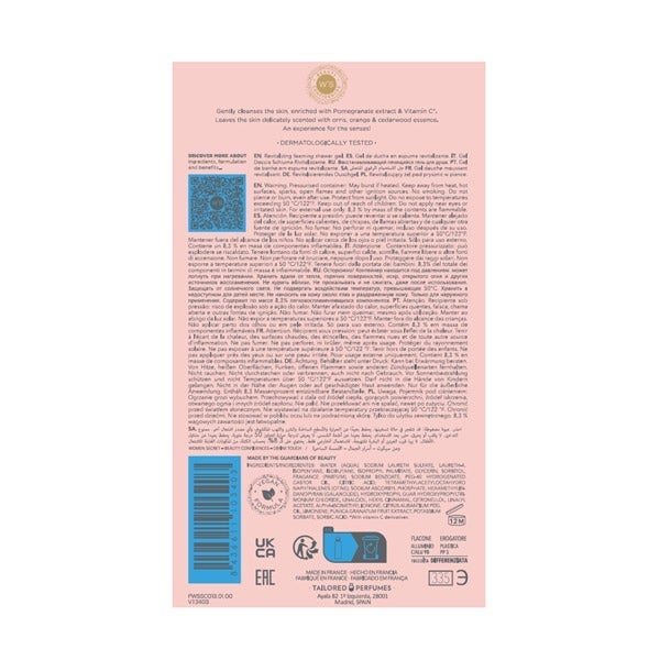INGREDIENTS/INGREDIENTES: WATER (AQUA), SODIUM LAURETH SULFATE, LAURETH-4, ISOPENTANE, ISOBUTANE, ISOPROPYL PALMITATE, GLYCERIN, SORBITOL, FRAGANCE (PARFUM), SODIUM BENZOATE, PEG-40 HYDROGENATED CASTOR OIL, CITRIC ACID, TETRAMETHYLACETYLOCTAHYDRO NAPHTHALENES (OTNE), SODIUM ASCORBYL PHOSPHATE, HEXAMETHYLINDANOPYRAN (GALAXOLIDE), HYDROXYPROPYL GUAR HYDROXYPROPYLTRIMONIUM CHLORIDE, LINALOOL, HEXYL CINNAMAL, CITRONELLOL, LINALYL ACETATE, ALPHA-ISOMETHYL IONONE, CITRUS AURANTIUM PEEL OIL, LIMONENE, PUNICA GRANATUM FRUIT EXTRACT, POTASSIUM SORBATE, SORBIC ACID.