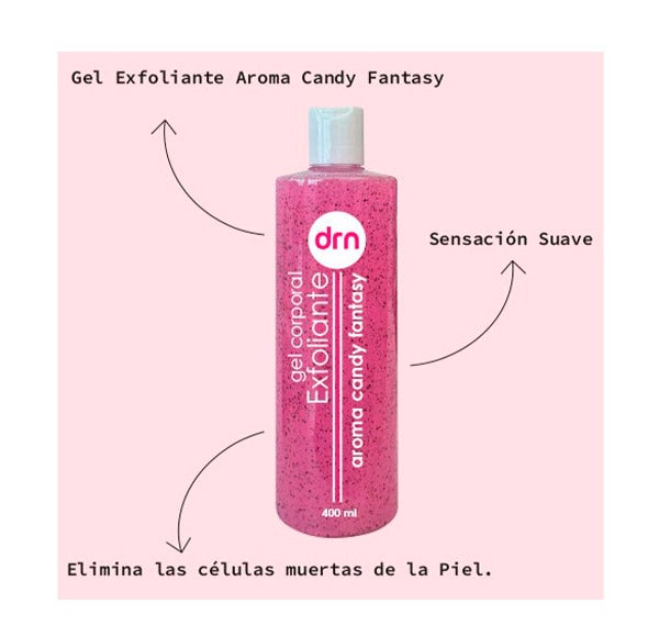 Gel corporal esfoliante com aroma a Candy Fantasy elimina suavemente as células mortas da pele para uma sensação instantaneamente mais suave e lisa.