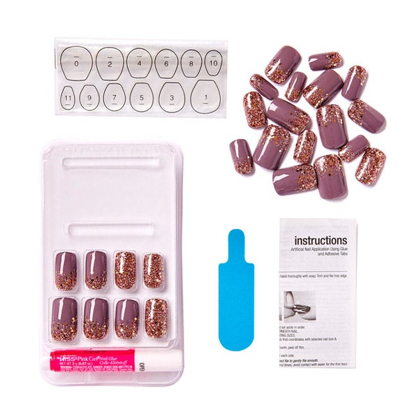 Contém 24 unhas, 24 abas mega adesivas, cola de gel rosa (2g), bastão de manicure e mini lima.