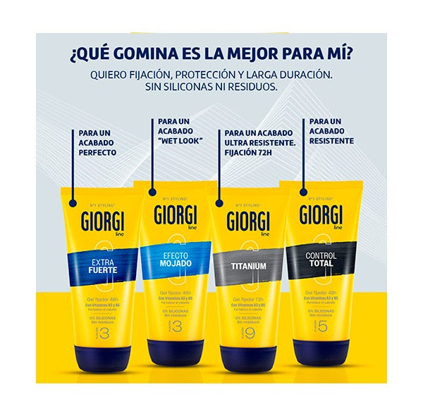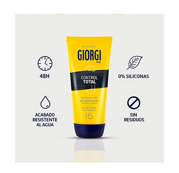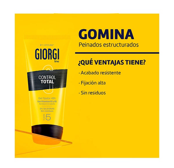 Prueba la Gomina Control Total de Giorgi que te proporciona un acabado resistente de larga duración.