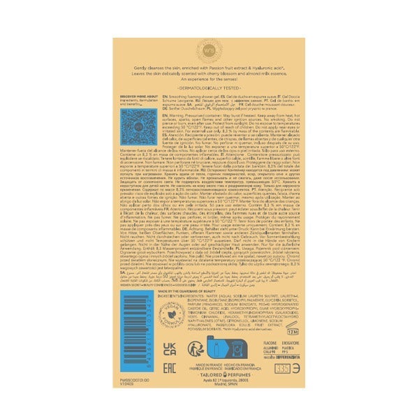 INGREDIENTS/INGREDIENTES: WATER (AQUA), SODIUM LAURETH SULFATE, LAURETH-4, ISOPENTANE, ISOBUTANE, ISOPROPYL PALMITATE, GLYCERIN, SORBITOL, PARFUM (FRAGANCE), SODIUM BENZOATE, PEG-40 HYDROGENATED CASTOR OIL, CITRIC ACID, HYDROXYPROPYL GUAR HYDROXYPROPYLTRIMONIUM CHLORIDE, HEXAMETHYLINDANOPYRAN (GALAXOLIDE), HEXYL CINNAMAL, LINALOOL, TETRAMETHYLACETYLOCTAHYDRO NAPHTHALENES (OTNE), CITRONELLOL, LIMONENE, SODIUM HYALURONATE, PASSIFLORA EDULIS FRUIT EXTRACT, POTASSIUM SORBATE.