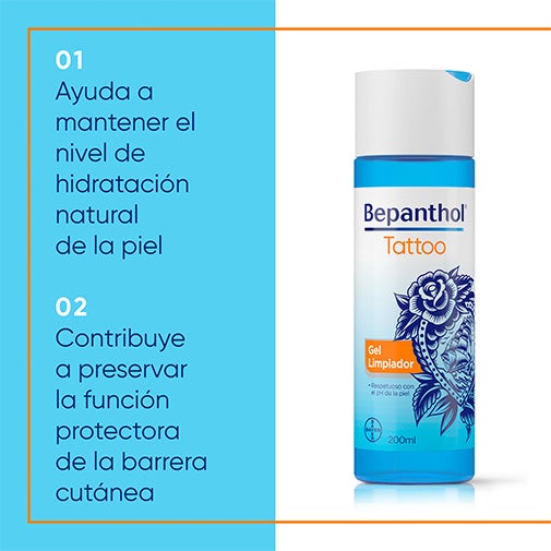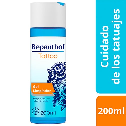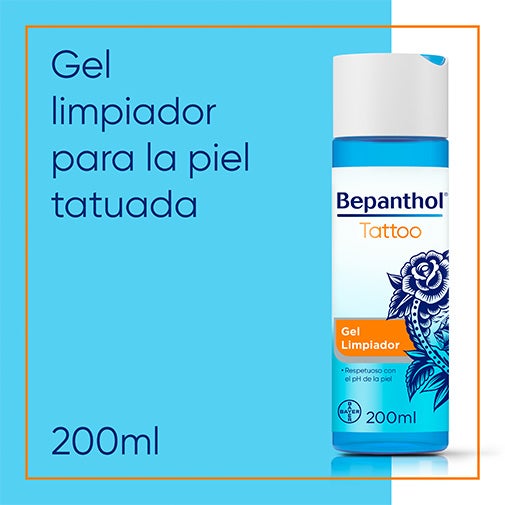 Bepanthol® Tattoo Gel Limpeza 200 ml é um gel de limpeza que foi especificamente formulado para a higiene das peles tatuadas.