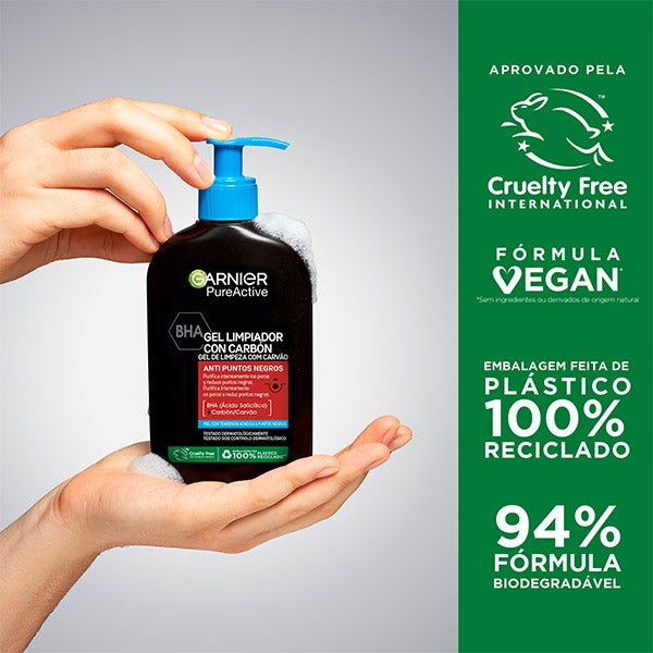 Garnier Pure Active Gel Limpiador Anti Pontos Negros enriquecido com BHA (Ácido Salicílico) e Carvão de origem natural, purifica a pele, reduz espinhas e pontos negros e previne sua reaparição para uma pele limpa e matificada.