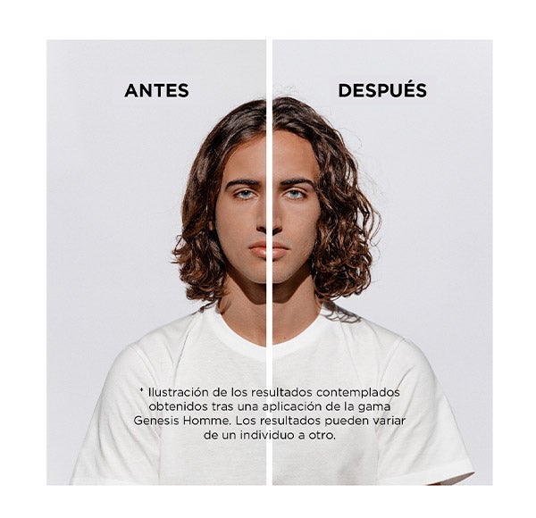 ***Teste clínico em 99 pessoas após o uso de Serum Fortifiant por 6 semanas. COMO FUNCIONA GENESIS HOMME? Uma dupla ação para o cliente: Imediatamente: FORTALECE E ENGROSSA A FIBRA DO CABELO graças às raízes de gengibre, creatina e polímeros expansivos. A longo prazo: AJUDA A REDUZIR A QUEDA DO CABELO, FORTALECENDO SUA ANCORAGEM E RETENÇÃO graças ao Aminexil.