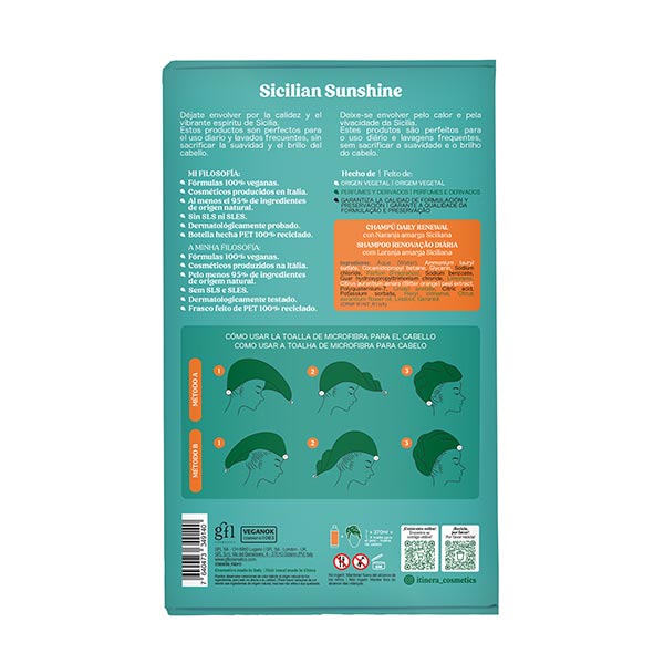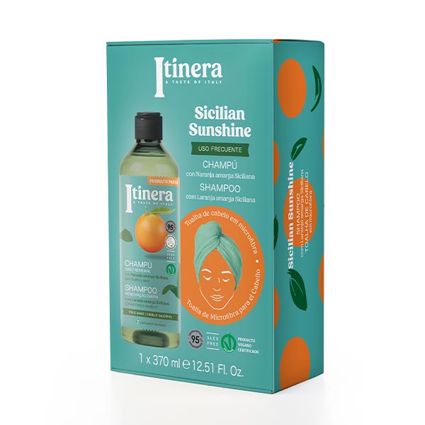 Este kit inclui um shampoo de laranja amarga da Sicília, conhecida por suas propriedades energizantes e refrescantes, combinado com uma toalha de microfibra para o cabelo.