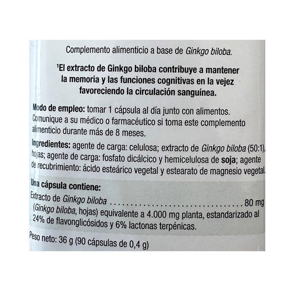 Agente de carga: celulosa; extracto de Ginkgo biloba (50:1), hojas; agente de carga: fosfato dicálcico y hemicelulosa de soja; agente de recubrimiento: ácido esteárico vegetal y estearato de magnesio vegetal.