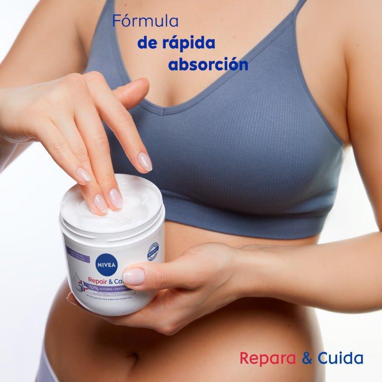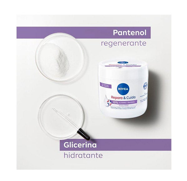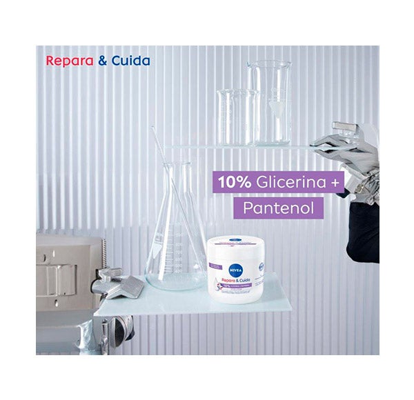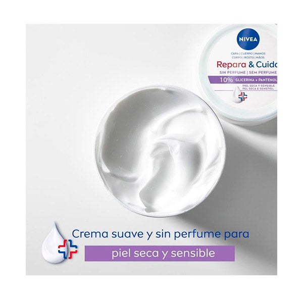 NIVEA Repara & Cuida Creme com 10% glicerina e pantenol sem perfume para pele seca e sensível. Sua fórmula suave, eficaz e sem perfume ajuda a acalmar a pele sensível e irritada, proporcionando um alívio duradouro contra a secura e mantendo a pele hidratada por 72h. Compatibilidade com a pele dermatologicamente aprovada.