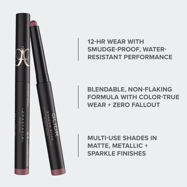 Zero pincéis. Zero manchas. Conforto o dia todo. Glidr Eyeshadow Stick de Anastasia Beverly Hills é uma sombra cremosa que se aplica em segundos e se esfumaça sem esforço. A fórmula desliza suavemente para esculpir, iluminar e definir delicadamente, depois fixa para um acabamento resistente a manchas e à água por até doze horas. Use nas pálpebras, ao longo da linha dos cílios ou na linha d'água para uma definição que abre o olhar. Use sozinho ou sobreponha vários tons para adicionar dimensão natural. Realça qualquer cor de olhos sem queda de pigmento e sem necessidade de pincel.