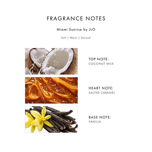 Glow by JLo Miami Sunrise captura a energia quente e radiante do amanhecer em Miami. Começa com notas brilhantes de toranja e cremoso leite de coco, fluindo para um coração tropical de doce frangipani rosa, e culmina em uma base sensual de vanilina e madeiras claras.