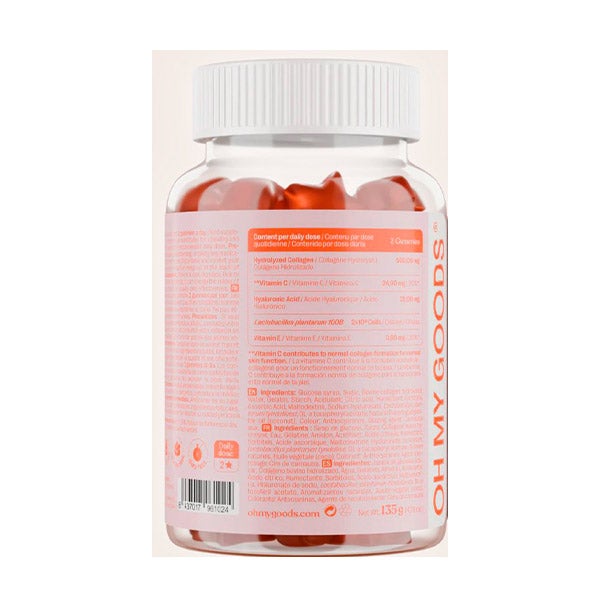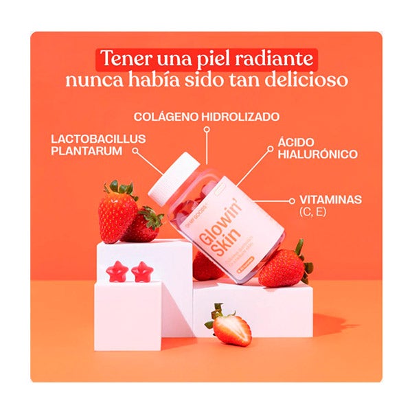 Jarabe de glucosa, Azúcar, Colágeno bovino hidrolizado, Agua, Gelatina, Almidón, Ácido cítrico, Sorbitoles, Ácido ascórbico, Maltodextrina, Hialuronato de Sodio, Lactobacillus plantarum tindalizado, DL-a tocoferil acetato, Aromatizantes naturales, Aceite vegetal (coco), Antocianinas, Cera de carnauba.