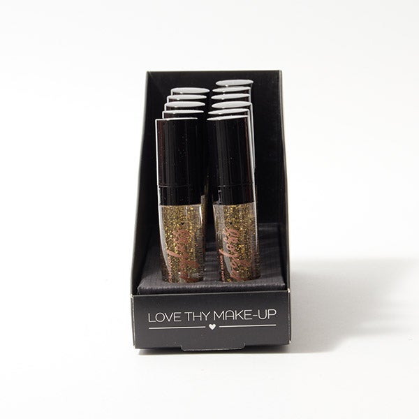 Brilho de espelho infundido com ácido hialurônico e hidratante e flocos de ouro para adicionar brilhos. Pode ser usado sozinho ou sobre a cor dos lábios como topper.