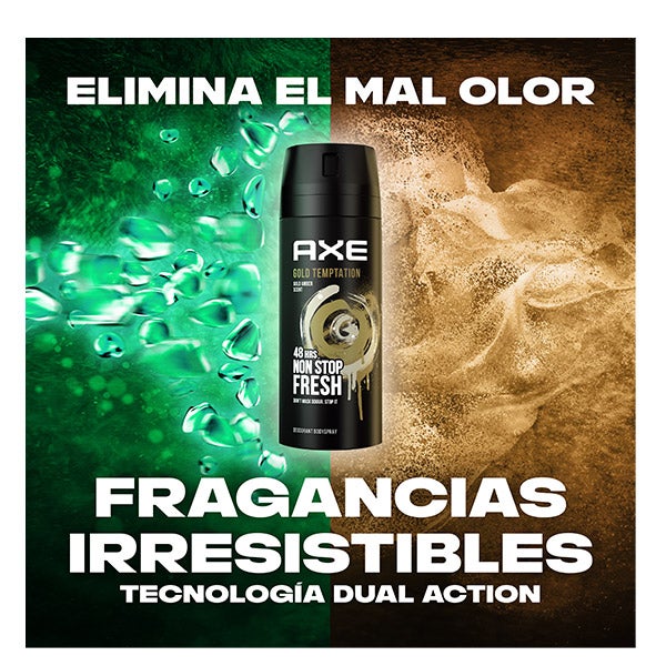 Desfrute da fragrância AXE Gold, Irresistível e sutil fragrância de madeira de agar e baunilha negra, para conseguir um caráter masculino e contemporâneo junto a um aroma incrível da manhã à noite.