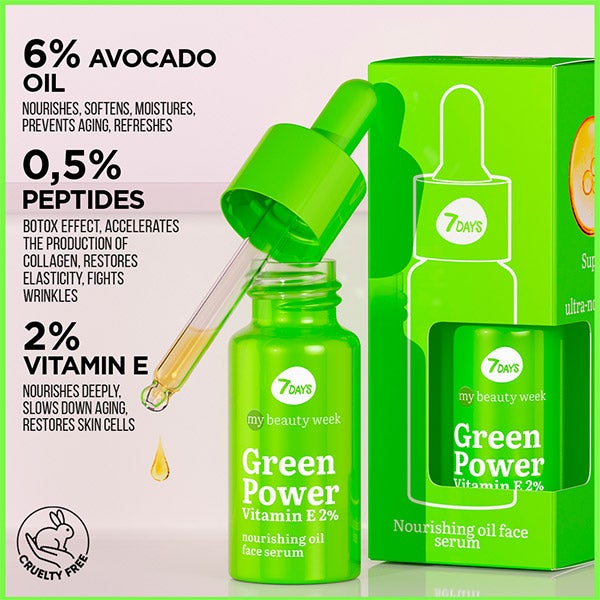 O soro ativador facial 7DAYS GREEN POWER com péptidos oferece procedimentos antienvelhecimento não injetáveis: hidratação profunda, nutrição intensiva, lifting, aumento da firmeza, elasticidade, redução de rugas. MY BEAUTY WEEK SMART care é uma combinação de ingredientes inteligentes e fórmulas inovadoras que proporcionam 100% de eficácia.