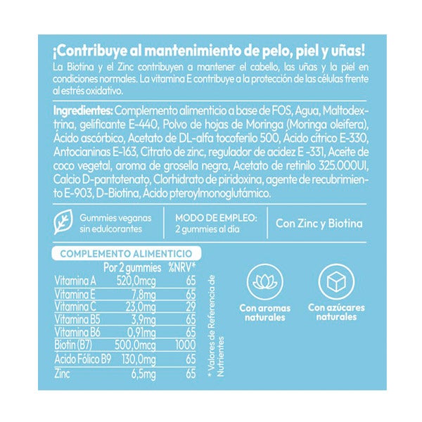 Complemento alimenticio a base de FOS, Agua, Maltodextrina, gelificante E-440, Polvo de hojas de Moringa (Moringa oleifera), ácido ascórbico, Acetato de DL- alfa tacoferilo 500, ácido cítrico E-330, Antocianinas E-163. Citrato de zinc, regulador de acidez E-331, Aceite de coco vegetal, aroma de grosella negra, Acetato de retinilo 325.000UI Calcio D-pantotenato, Clorhidrato de prioxidina, agente de recubrimiento E-903, D-Biotina, Ácido pteroylmonoglutámico.