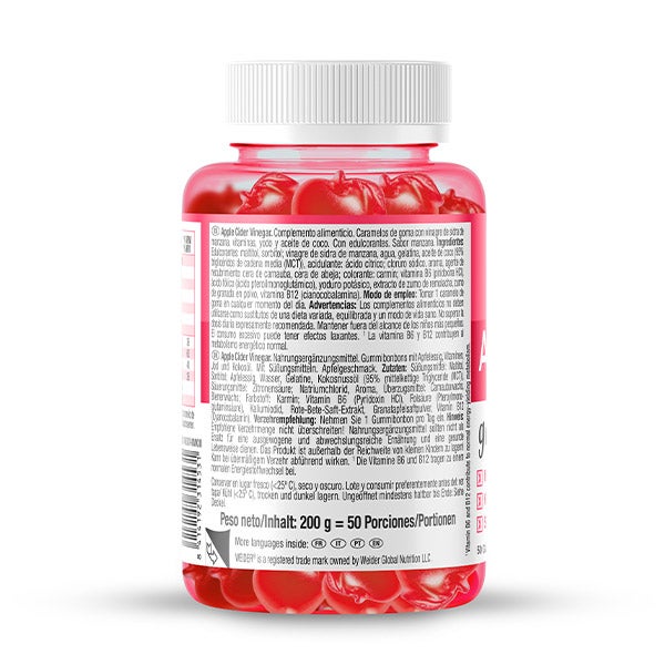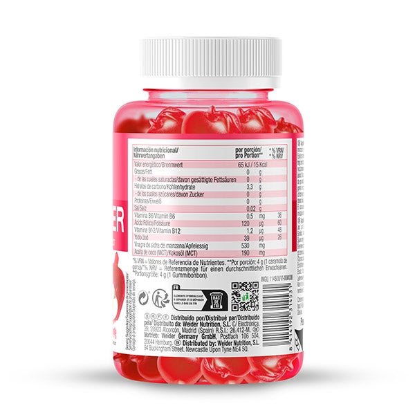 Edulcorantes: maltitol, sorbitol; vinagre de sidra de manzana, agua, gelatina, aceite de coco (95% triglicéridos de cadena media (MCT)), acidulante: ácido cítrico; cloruro sódico, aroma, agente de recubrimiento: cera de carnauba, cera de abeja; colorante: carmín; vitamina B6 (piridoxina HCl), ácido fólico (ácido pteroilmonoglutámico), yoduro potásico, extracto de zumo de remolacha, zumo de granada en polvo, vitamina B12 (cianocobalamina).