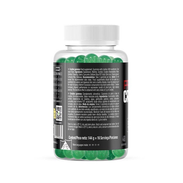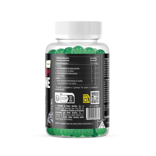 Gomas de Creatina Premium (sabor maçã) combina a eficácia da creatina monohidratada de máxima pureza Creapure® com um formato inovador e prático: gomas com um agradável sabor a maçã e totalmente livres de açúcar.