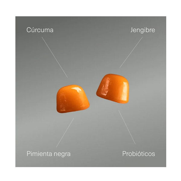 Sirope de glucosa, azúcar, agua, gelificante (pectina), extracto de cúrcuma (Cúrcuma longa L.), acidulante (ácido citrico), regulador de acidez (citrato trisódico), aromas naturales, Lactobacillus paracasei, aceite vegetal (coco), extracto de jengibre (Zingiber officinale Roscoe), antiaglomerante (cera de carnauba), extracto de pimienta negra (Piper nugrum)