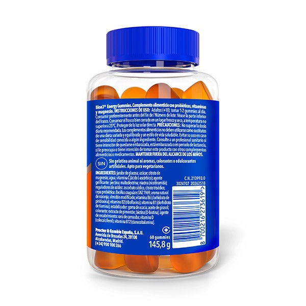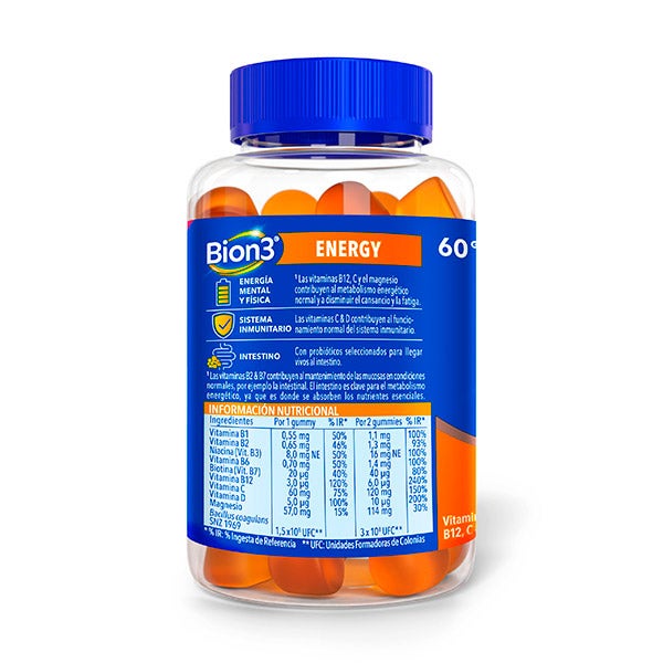 Jarabe De Glucosa; Azúcar; Citrato De Magnesio; Agua; Vitamina C (Ácido L-Ascórbico), Agente Gelificante: Pectina; Maltodextrina; Niacina (Nicotinamida), Reguladores De Acidez: Ascorbato Sódico; Citrato Trisódico, Cepa Probiótica: Bacillus Coagulans SNZ 1969; Aroma Natural De Naranja; Almidón Modificado; Vitamina B6 (Clorhidrato De Piridoxina); Vitamina B2 (Riboflavina); Vitamina B1 (Clorhidrato De Tiamina), Estabilizador: Goma De Acacia; Aceite De Girasol, Colorante: Extracto De Pimentón; Biotina (D-Biotina), Agente De Recubrimiento: Cera De Carnauba; Vitamina D (Colecalciferol); Vitamina B12 (Cianocobalamina)