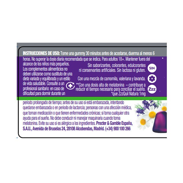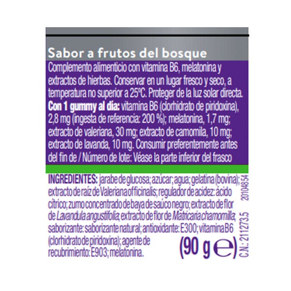Jarabe de glucosa, azúcar, agua, gelatina (bovina), extracto de raíz de Valeriana officinalis, regulador de acidez, ácido cítrico, zumo concentrado de baya de saúco negro, extracto de flor de Lavandula angustifolia, extracto de flor de Matricaria chamomilla, saborizante: saborizante natural, antioxidante: E300, vitamina B6 (clorhidrato de piridoxina), agente de recubrimiento: E903, melatonina.