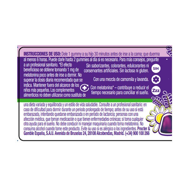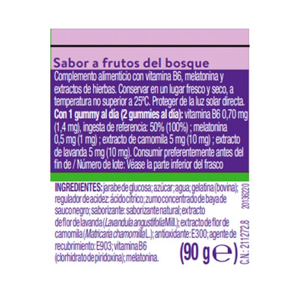Jarabe de glucosa, azúcar, agua, gelatina (bovina), regulador de acidez, ácido cítrico, zumo concentrado de baya de sauco negro, saborizante: saborizante natural, extracto de flor de lavanda (Lavandula angustifoliaMill.) extracto de flor de camomila (Matricaria chamomilla L.), antioxidante: E300, agente de recubrimiento: E903, vitamina B6 (clorhidrato de piridoxina), melatonina.