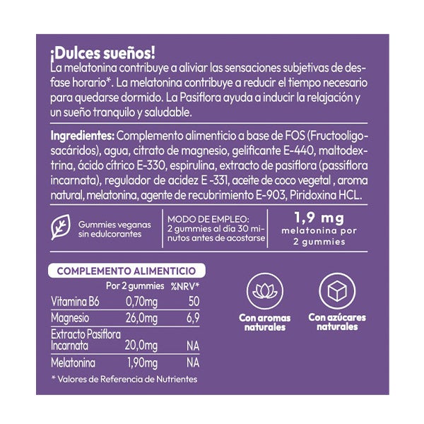 Complemento alimenticio a base de FOS (Fructooligosacáridos), agua, citrato de magnesio, gelificante E-440, maltodextrina, ácido cítrico E-330, espirulina, extracto de pasiflora (passiflora incarnata), regulador de acidez E-331, aceite de coco vegetal, aroma natural, melatonina, agente de recubrimiento E-903, Pridoxina HCL.