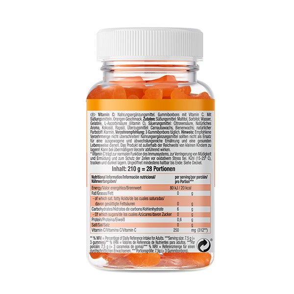 Vitamin C é 100% livre de glúten, sem açúcar e foi elaborado com corantes e aromas naturais. Uma dose de 3 gomas por dia fornece até 250% da vitamina C que forneceria a di