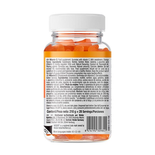 Vitamin C da Weider não é uma vitamina C convencional. Trata-se de uma forma inovadora e revolucionária de tomar vitamina C graças ao seu formato em goma e ao seu delicioso sabor de laranja.