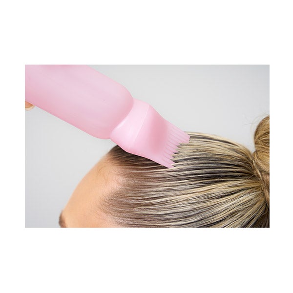 Incline a garrafa e passe o pente pelo seu couro cabeludo, apertando levemente a garrafa se necessário para distribuir o produto.