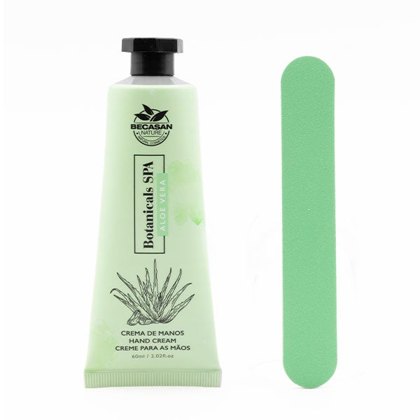 Contém um creme para as mãos de Aloe Vera e uma lixa de unhas.