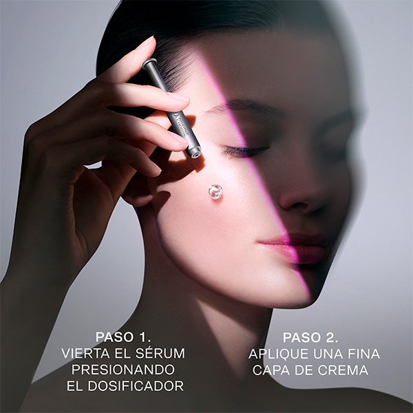 Paso 1: Active el frasco para aplicar el concentrado en la palma de su mano. Usando las yemas de los dedos, extienda sobre la cara, cuello y escote, evitando el área de los ojos. Permita que se absorba completamente.