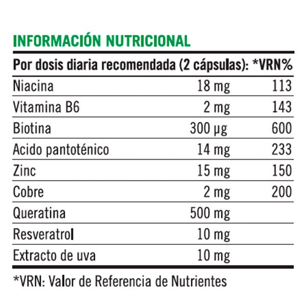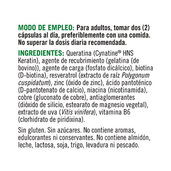 Queratina (Cynatine® HNS Keratin), agente de recubrimiento (gelatina (de bovino)), agente de carga (fosfato dicálcico), biotina (D-biotina), resveratrol (extracto de raíz Polygonum cuspidatum), zinc (óxido de zinc), ácido pantoténico (D-pantotenato de calcio), niacina (nicotinamida), cobre (gluconato de cobre), antiaglomerantes (dióxido de silicio, estearato de magnesio vegetal), extracto de uva (Vitis vinifera), vitamina B6 (clorhidrato de piridixina).