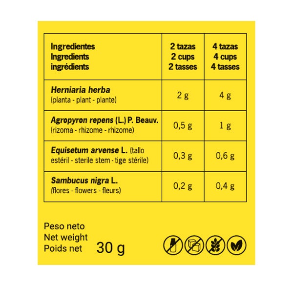 Herniaria (Herniaria herba) (Planta entera) gama de las boticas (Agropyron repens (L) P. Beauv. (rizoma) cola de caballo (Equisetum arvense L.)(tallos estériles) saúco (Sambucus nigra L.) (flores)