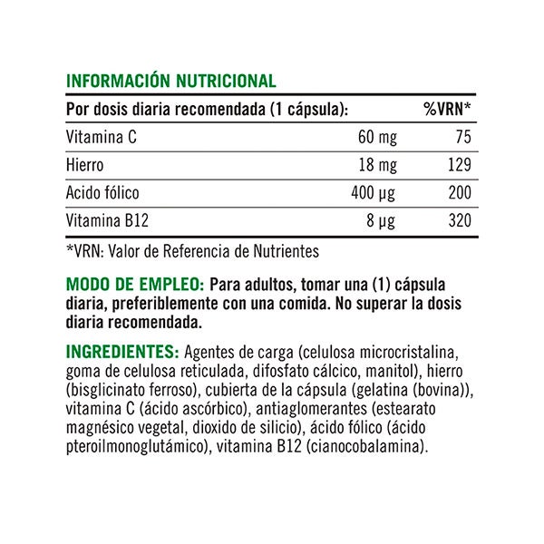 Agentes de carga (celulosa microcristalina, goma de celulosa reticulada, difosfato cálcico, manitol), hierro (bisglicinato ferroso), cubierta de la capsula (gelatina (bovina)), vitamina C (ácido ascórbico), antiaglomerantes (estearato magnésico vegetal, dioxido de silicio), ácido fólico (ácido pteroilmonoglutámico), vitamina B12 (cianocobalamina).