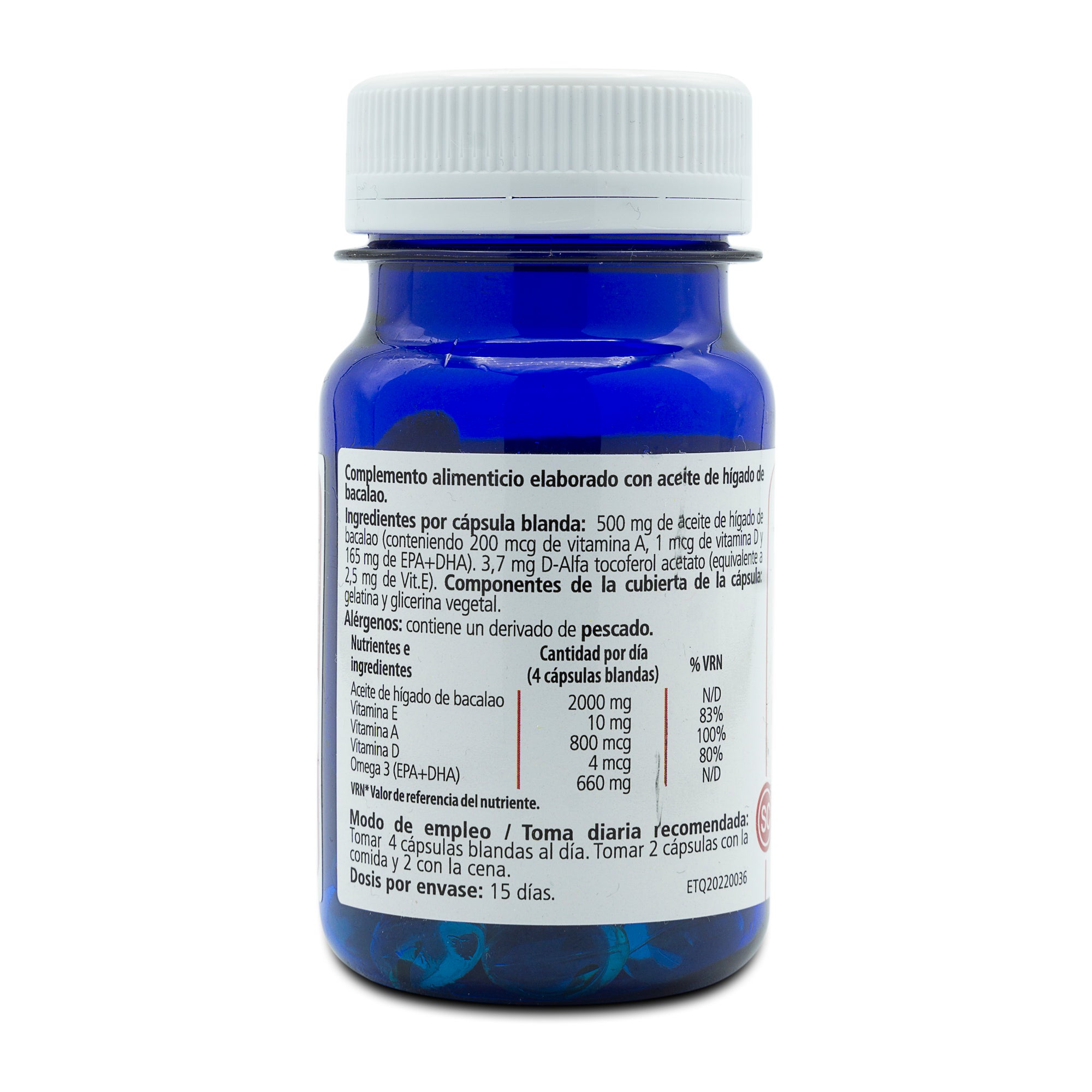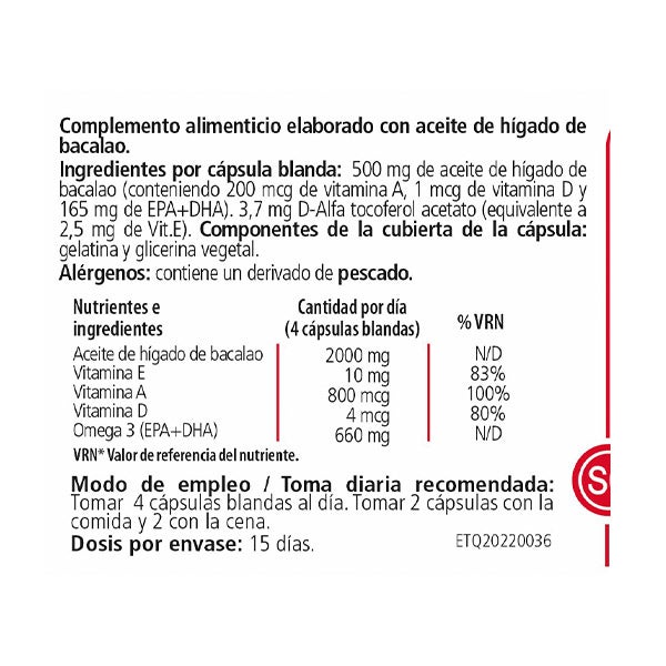 Ingredientes por cápsula blanda: 500 mg de aceite de hígado de bacalao (conteniendo 200 mcg de vitamina A, 1 mcg de vitamina D y 165 mg de EPA+DHA). 3,7 mg D-alfa todoferol acetato (equivalente a 2.5 mg de Vit. E). Cubierta de la capsula: gelatina y glicerina vegetal.