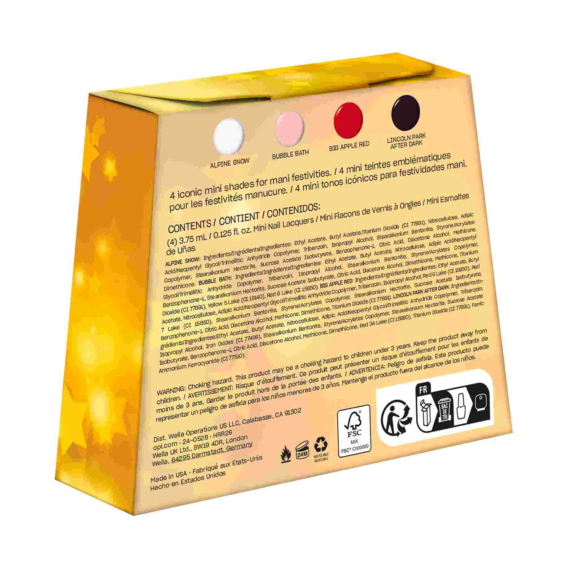 4 mini Nail Lacquer (1 por tom): Bubble Bath, Alpine Snow, Big Apple Red, Lincoln Park after Dark.