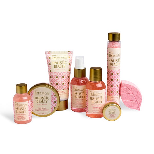 Embarque em uma jornada de relaxamento com nosso luxuoso conjunto Holistic. Mergulhe no sereno aroma de flor de lótus e chá branco enquanto se mima com um banho de espuma, loção corporal, esfoliante, gel de banho, cristais de banho, spray para travesseiros, bálsamo labial e mais.