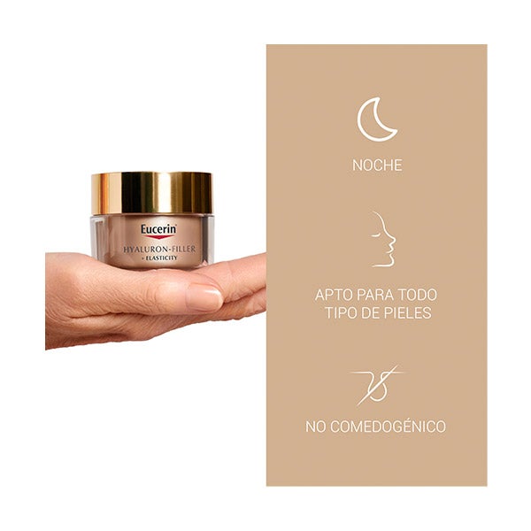 Hyaluron-Filler + Elasticity Noite da Eucerin é um creme facial formulado para reduzir os sinais avançados do envelhecimento graças a quatro ingredientes chave: