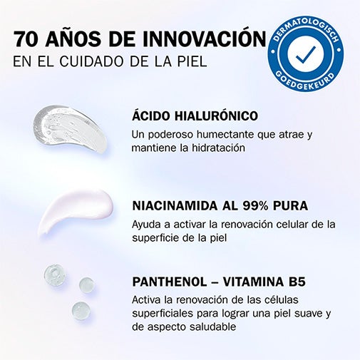 Esta fórmula oferece uma hidratação supercarregada que dura o dia todo com ácido hialurônico, niacinamida e peptídeos.