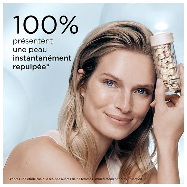 Clinicamente comprovado que aumenta os níveis naturais de AH da pele em 109%¹, essas cápsulas atuam como um preenchimento, mas encapsulado, para um efeito de preenchimento instantâneo de 39%² e uma pele visivelmente mais firme.
